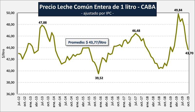 En el gráfico siguiente se toma como referencia un producto básico como la leche común entera por litro, en este caso de CABA por contar con una serie un poco más prolongada en el tiempo y se la actualiza por el índice de precios al consumidor, observándose que el precio de octubre 2019 se encuentra en un valor igual a del promedio del toda la serie.