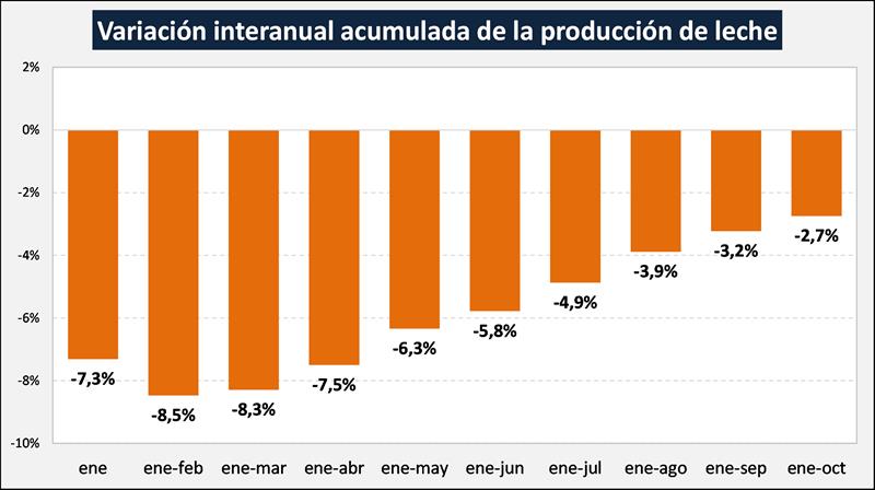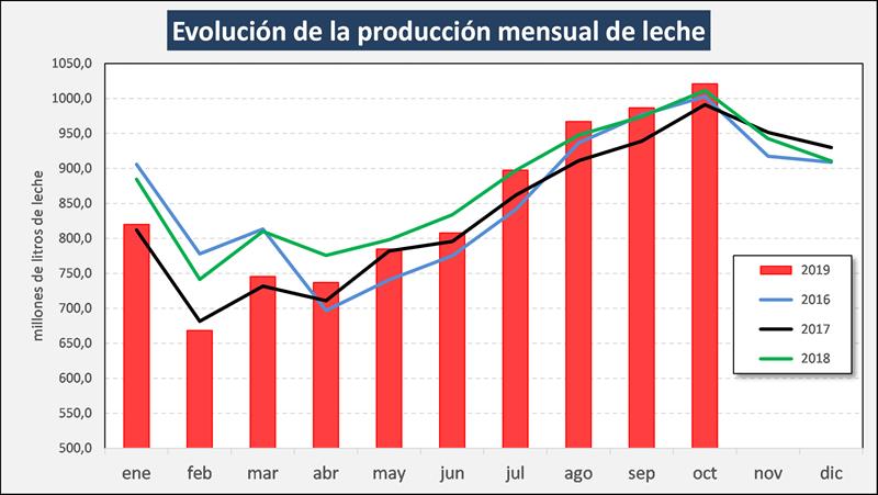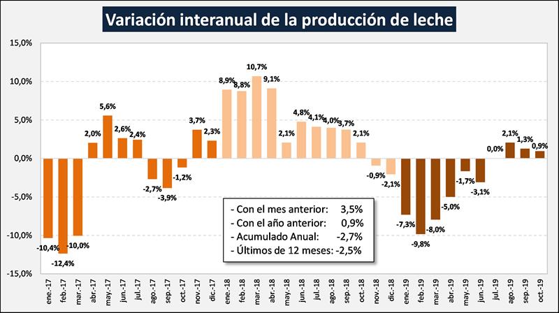 En el mes de octubre de 2019 la producción fue de 1.021, millones de litros de leche, este valor representa una suba del 3,5% respecto al mes anterior (+0,16% en promedio diario) y un 0,9% más que igual mes del año anterior. El acumulado de los 10 meses de 2019 arrastra una caída del 2,7% respecto a 2018. La media móvil de los últimos 12 meses muestra un decrecimiento interanual del 2,5%.