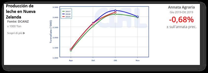 En Nueva Zelanda, los datos de octubre, el mes de máxima producción, registraron -2,6% en comparación con octubre de 2018. La industria láctea esperaba esta disminución. La variación general de la temporada de producción es -0,68% en comparación con junio-octubre de 2018.
