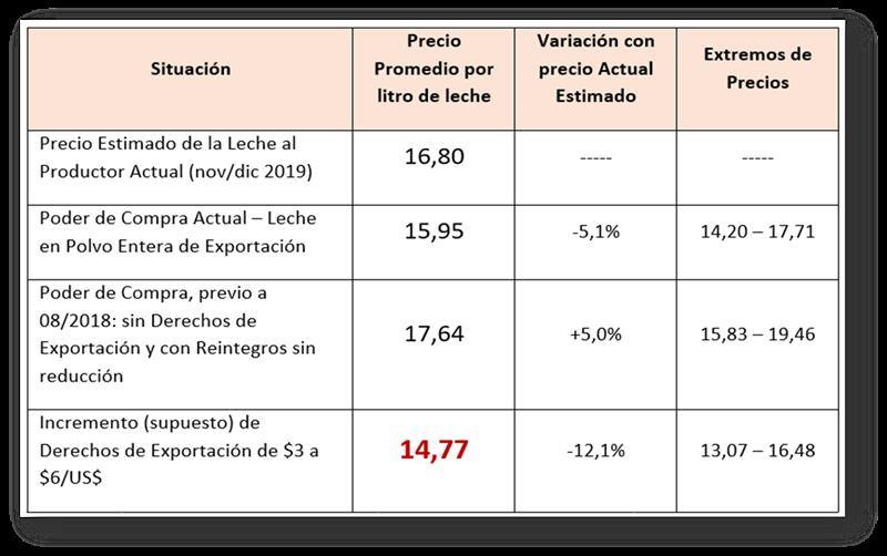 Las exportaciones representan en la actualidad alrededor del 18% del destino de la leche producida y aproximadamente el 24% de ellas corresponde en valor a leche en polvo entera en la presentación aquí calculada. El cuadro de doble entrada tiene por un lado los valores de costos de elaboración y comercialización, el tipo de cambio, el derecho de exportación, el reintegro de impuestos, un margen industrial, y la conversión de litros de leche a kilogramos de producto. Por otro lado el valor que se puede conseguir por el producto, en dólares por tonelada, dependiendo básicamente del destino y del volumen de la operación.