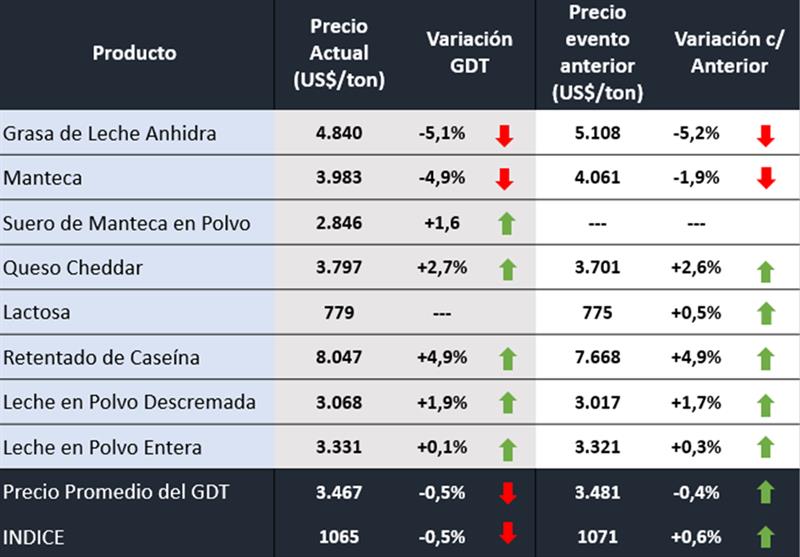 -GDT Price Index indica el promedio del cambio porcentual en los precios para cada especificación, ponderado por la cantidad de cada especificación vendida. GDT proporciona un cambio en el índice de precios de GDT del evento anterior para todos los productos, además de un equivalente para cada grupo de productos y cada combinación de grupo de productos/período de contrato. El índice de precios proporciona un reflejo más preciso de los movimientos de precios entre los eventos comerciales.