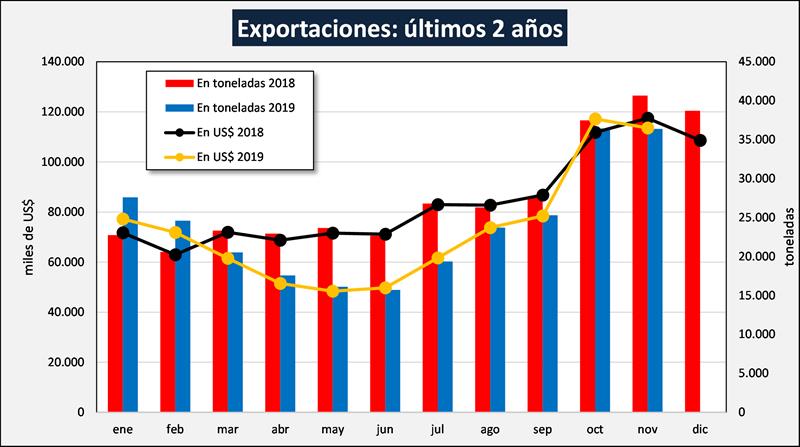 Como puede verse en el gráfico de abajo, en noviembre aunque las exportaciones mantuvieron niveles altos respecto a los 9 primeros meses del año, fueron casi iguales en volumen que en octubre e inferiores en valor. Es probable que las exportaciones desde diciembre, y en adelante no presenten altos registros en función de la menor producción estacional, y sobre todo porque el principal producto de exportación (LPE), ha tenido un incremento importante en los derechos de exportación (9%), el tipo de cambio oficial se mantiene fijo a pesar que el proceso inflacionario continúa y el dólar no oficial sigue subiendo, y además porque que hubo una importante caída de los precios internacionales en la última subasta del GDT (-6,7% LPE = US$ 3.099/ton.).
