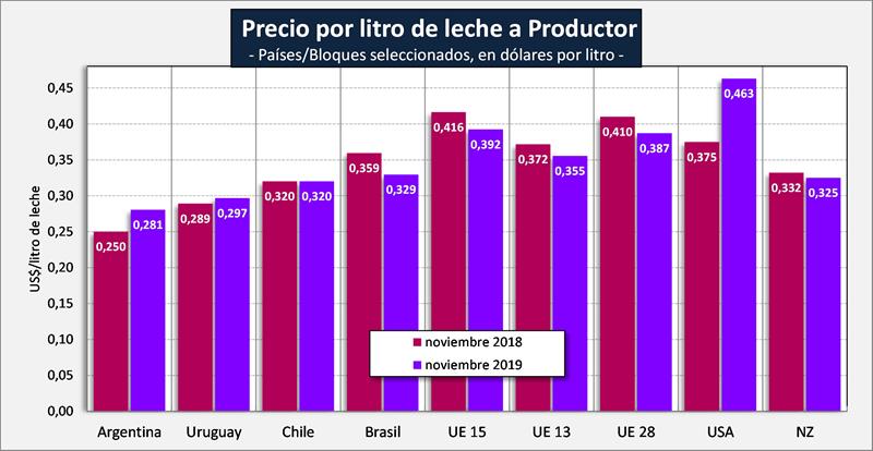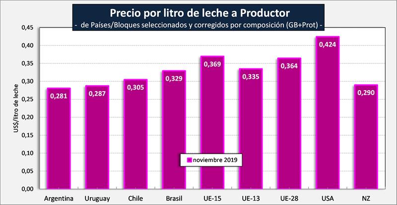 Precios de Leche Cruda en los principales Países/Bloques 14/1/2020Precio de la Leche al Productor en dólares por litro: ![]() Fuentes: DNL-MAGyP, INALE, ODEPA, CEPEA/ESALQ USP, EMMO, USDA y CLAL, respectivamente. Precio de la Leche al Productor en dólares por litro, corregidos por Sólidos Útiles (Grasa Butirosa + Proteína): ![]() Observaciones: los precios en el gráfico de arriba han sido corregidos sólo por sólidos útiles (grasa butirosa y proteína) y no por el resto de componentes que hacen a la calidad higiénica y sanitaria, ni tampoco por tipo de cambio real. elaborado por el OCLA con información de diferentes fuentes