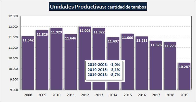 Respecto al número de Unidades productivas a marzo de 2019 son 10.287 tambos, si a eso le restamos ese 4,4% mencionado como error de relevamiento, nos da un valor de 9.830 unidades productivas. Este es un número de inicios del año 2019, con lo que con la tasa de cese que se viene dando, es dable suponer un 2% de caída en los meses transcurridos, con lo cual el valor se va a 9.600 tambos.