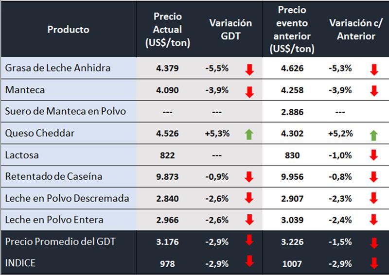 -GDT Price Index indica el promedio del cambio porcentual en los precios para cada especificación, ponderado por la cantidad de cada especificación vendida. GDT proporciona un cambio en el índice de precios de GDT del evento anterior para todos los productos, además de un equivalente para cada grupo de productos y cada combinación de grupo de productos/período de contrato. El índice de precios proporciona un reflejo más preciso de los movimientos de precios entre los eventos comerciales.