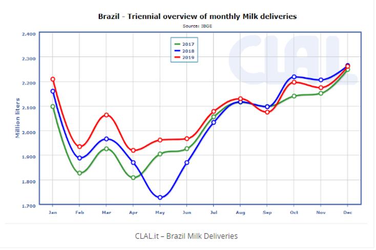 Durante finales de 2019 y principios de 2020, la región sureste de Brasil sufrió un clima seco, lo que redujo el volumen y la calidad del forraje en muchos establecimientos lecheros. Como resultado, la producción disminuyó considerablemente durante ese tiempo.