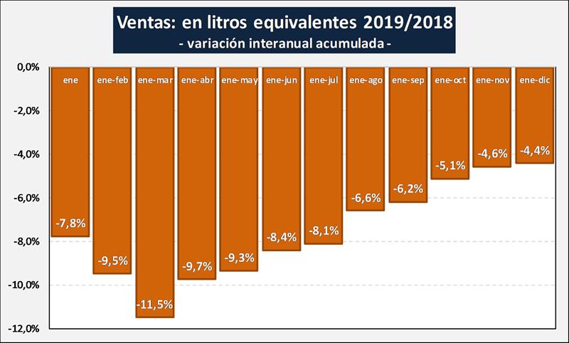 En el gráfico siguiente se presentan las ventas acumuladas mes a mes de 2019, comparadas con las ventas de 2018 y puede observarse claramente que la caída en la ventas/consumo, se dio en forma creciente hasta el mes de marzo y de allí en adelante la situación mejoró paulatinamente hacia finales del año.