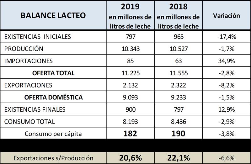 El balance lácteo arrojó las siguientes cifras para el año 2019: