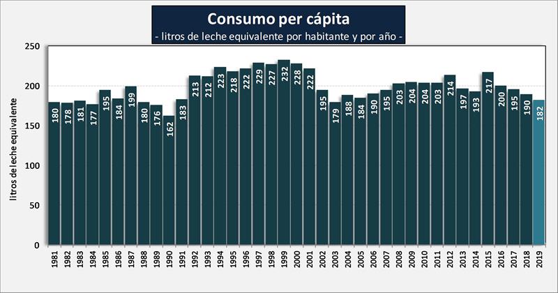 El consumo per cápita del año 2019, arroja un valor de 182 litros por habitante y por año, lo que representa una disminución del 3,8% respecto al año anterior y es el valor más bajo desde el año 2003.
