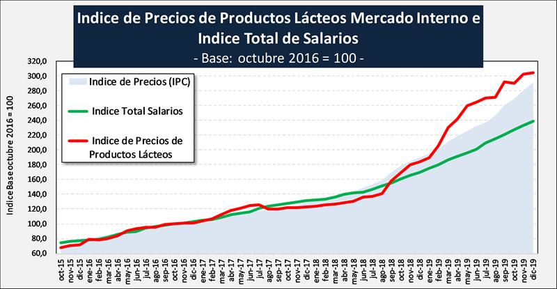 El gráfico anterior se construye sobre la base de los precios por litro de leche equivalente a consumidor final que mensualmente calcula IAPUCo y el Índice de Salarios Totales: Salario Registrado (privado y público) y Salario Privado no Registrado y utilizando la metodología para el cálculo del coeficiente de variación de salarios (C.V.S.) del Decreto 1242/2002, en ambos casos se parte de un número índice igual 100 para el mes de octubre de 2016. Además, se agrega un área (celeste clara) que indica la evolución de la inflación (IPC).