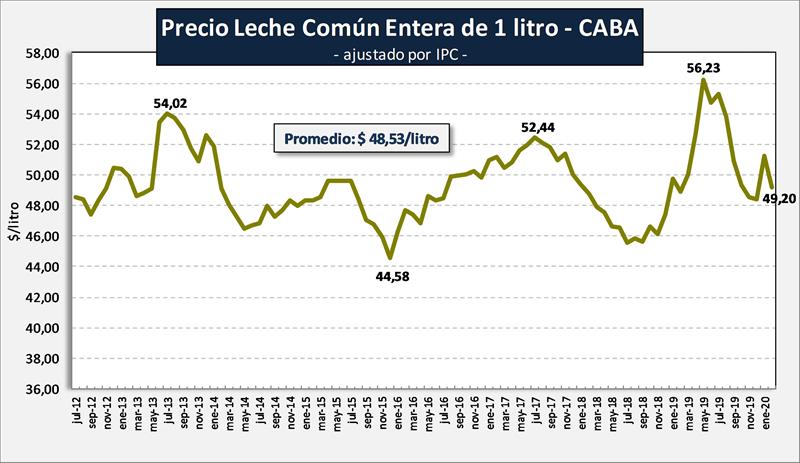 En el gráfico siguiente se toma como referencia un producto básico como la leche común entera por litro, en este caso de CABA por contar con una serie un poco más prolongada en el tiempo y se la actualiza por el índice de precios al consumidor, observándose que el precio de febrero 2020 se encuentra en un valor 1,4% superior al promedio de toda la serie, -4,0% respecto al mes anterior y +0,7 en la comparación interanual.
