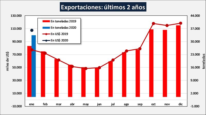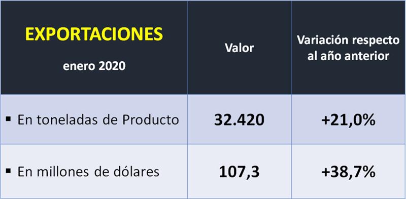 Las exportaciones del mes de enero de 2020, como puede observarse en el cuadro superior, subieron un 21,0% en volumen de producto y 38,7% en monto total en dólares respecto al mismo mes del año 2019. A pesar de mantener un ritmo inercial con finales de 2019 (lo que hace dar otra idea por la comparación interanual), respecto al mes anterior (diciembre 2019) las exportaciones cayeron 13,7% en volumen y 9,2% en valor.