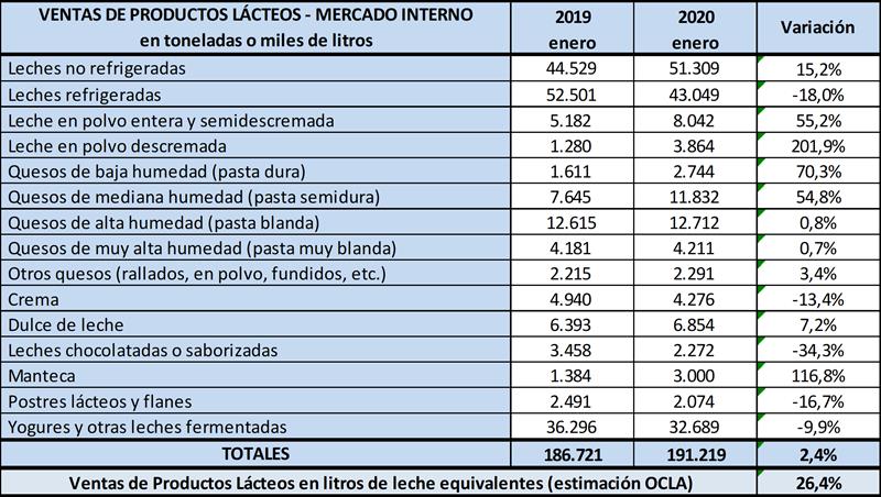 En el cuadro se observa un aumento del 2,4% en las ventas en volumen de productos (toneladas y miles de litros) y un aumento del 26,4% en litros de leche equivalentes, el 50% de ese incremento proviene de leches en polvos destinadas a ventas industriales y fundamentalmente a ventas institucionales (licitaciones públicas) y el otro 50% del aumento en la venta de quesos, sobre todo los de pasta semidura. Tanto para leche en polvo como para quesos de pasta semidura, la base de comparación de enero de 2019 es una de las más bajas de los últimos años.
