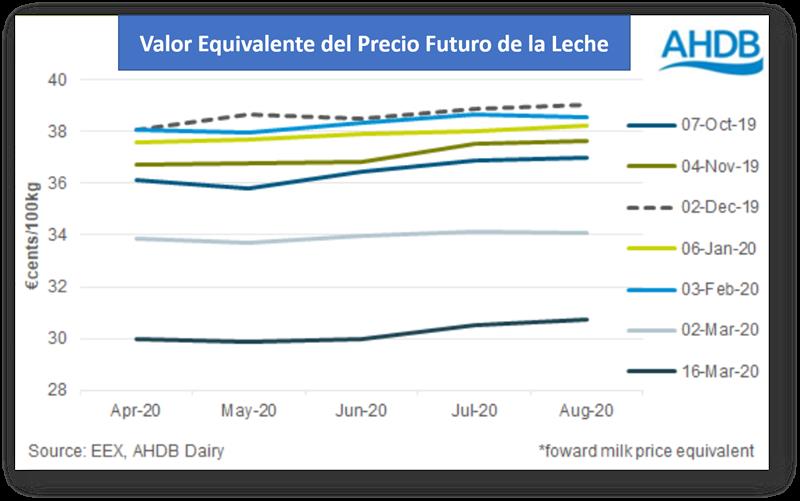 El valor equivalente de precio de la leche a futuro (FMPE) combina los precios liquidados de los contratos de futuros de manteca y leche en polvo descremada en el intercambio EEX. Entre octubre de 2019 y febrero de 2020, el FMPE permaneció en la región de € 0,35 a € 0,39/kg. para contratos que vencen de abril a agosto.