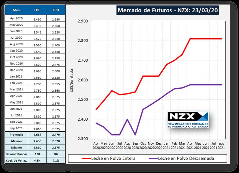 - Leche en Polvo Descremada: prácticamente sin cambios, con un mínimo de US$ 2.320 para jun y sep/20 y con alta variabilidad.
