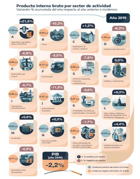 Nivel de Actividad - PBI 25/3/2020Informe de avance del nivel de actividad Cuarto trimestre de 2019 Estimaciones preliminares del PIB para el cuarto trimestre de 2019 La estimación preliminar del producto interno bruto (PIB), en el cuarto trimestre de 2019, muestra un decrecimiento de 1,1% con relación al mismo período del año anterior. El PIB desestacionalizado del cuarto trimestre de 2019, con respecto al tercer trimestre de 2019, arroja una variación de -1,0%, mientras que la tendencia-ciclo muestra una variación negativa de 0,5%. ![]() Estimaciones preliminares del Valor Agregado Bruto a precios básicos desagregado por sector de actividad económica, cuarto trimestre 2019: · El valor agregado del sector agricultura, ganadería, caza y silvicultura creció un 1,1% en el cuarto trimestre con respecto a igual lapso del año anterior. · El valor agregado del sector pesca observó un decrecimiento interanual de 19,5%. · El valor agregado de explotación de minas y canteras creció 1,6%. · La industria manufacturera registró una baja en el nivel de actividad de 2,1%. · El nivel de actividad del sector electricidad, gas y agua creció 3,5% durante el cuarto trimestre de 2019 con respecto al mismo trimestre de 2018. · La actividad de la construcción tuvo una baja de 8,3% en el cuarto trimestre. · El sector comercio mayorista y minorista, y reparaciones tuvo una caída de 2,6%. · El sector hoteles y restaurantes registró una suba de 1,0%. · El sector transporte, almacenamiento y comunicaciones se mantuvo sin cambios. · Durante el transcurso del cuarto trimestre de 2019, la actividad de intermediación financiera observó un decrecimiento de un 8,6%. · El sector actividades inmobiliarias, empresariales y de alquiler experimentó un crecimiento de 0,9%. · El sector administración pública, defensa y planes de seguridad social de afiliación obligatoria presentó una suba de 0,8%. · El sector de enseñanza mostró un aumento de 0,8%. · Los servicios sociales y de salud tuvieron un incremento de 0,5%. · El sector otras actividades de servicios comunitarios, sociales y personales decreció un 1,0%. · El sector hogares privados con servicio doméstico registró un crecimiento de 2,7%. ![]() extractado por el OCLA del Informe de INDEC