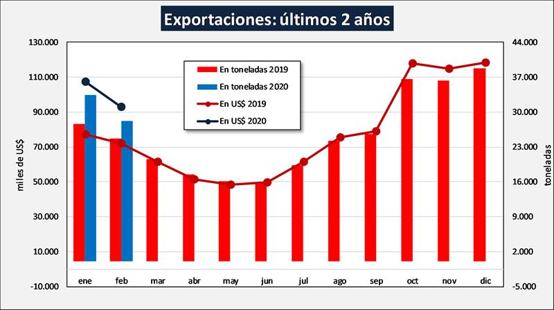 Las exportaciones del mes de febrero de 2020, subieron un 14,1% en volumen de producto y 29,1% en monto total en dólares respecto al mismo mes del año 2019. Mantienen un ritmo inercial con finales de 2019 (lo que hace dar otra idea por la comparación interanual), respecto al último mes del año anterior (diciembre 2019) las exportaciones cayeron 27,3% en volumen y 21,2% en valor. Como puede verse en el cuadro superior, el acumulado bimestral es mayor en un 17,8% en volumen y 34,1% en valor.