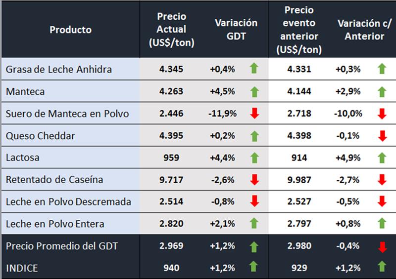 -GDT Price Index indica el promedio del cambio porcentual en los precios para cada especificación, ponderado por la cantidad de cada especificación vendida. GDT proporciona un cambio en el índice de precios de GDT del evento anterior para todos los productos, además de un equivalente para cada grupo de productos y cada combinación de grupo de productos/período de contrato. El índice de precios proporciona un reflejo más preciso de los movimientos de precios entre los eventos comerciales.