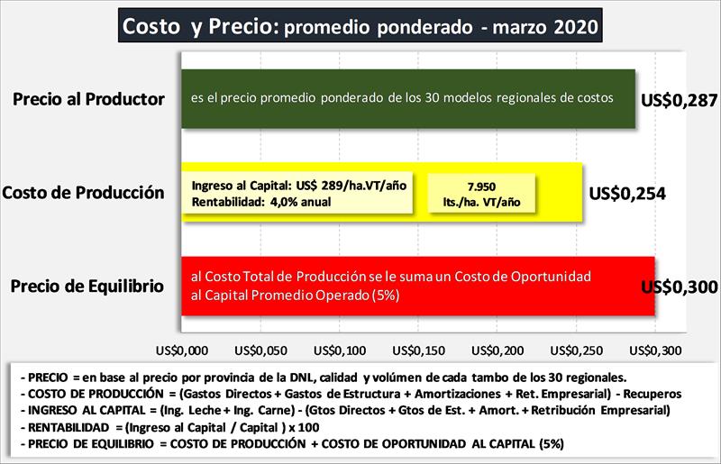 Si suponemos un tasa de rentabilidad exigida al capital del 5%, se debería generar un Ingreso Neto de $ 23.113/ha./año ($ 323.969 mensuales sobre la superficie considerada), que dividido por los 7.950 litros de leche de productividad promedio, deberían generar un ingreso neto unitario de $ 2,91/litro de leche. Por lo tanto, el Precio de Equilibrio sería en este supuesto de $ 18,94/litro de leche ($ 16,03 de Costo Total + $ 2,91 de Rentabilidad al Capital), unos US$ 0,30/litro.