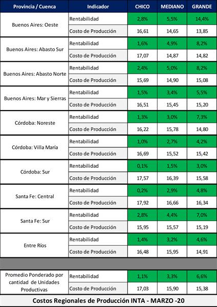 Costos Regionales de Producción de Leche, valores actualizados a MARZO de 2020 22/4/2020