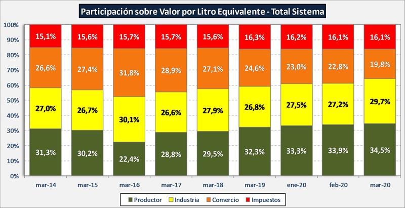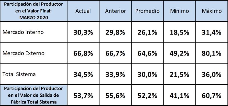 La participación del productor en el total del sistema fue para marzo 2020 del 34,5%, superior al mes anterior (máximo de la serie en junio de 2019 con el 36,0%) y bastante por encima de la media del 30,0%. Una situación similar se da para la participación en los valores finales de mercado interno. La participación del productor sobre el valor de salida de fábrica (precio al que vende la industria) fue de 53,7%, 1,9 puntos porcentuales por debajo del mes anterior, y 1,5 puntos por encima de la media de la serie disponible, cabe recordar que la serie histórica para salida de fábrica es un año más extensa que las otras.