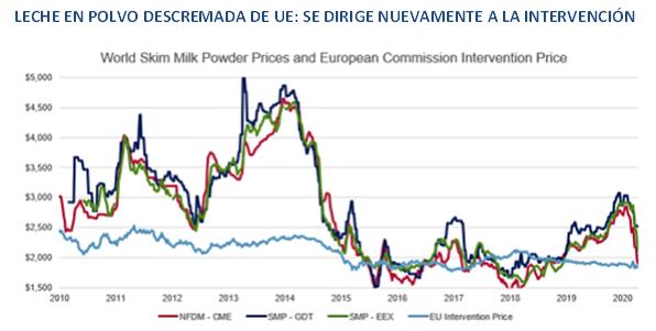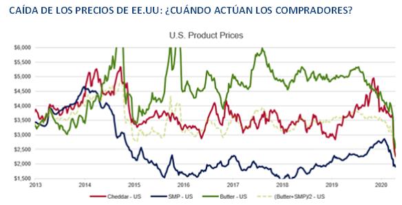 Consumo de productos lácteos nacionales: se redujo drásticamente por la caída en los canales de servicio de alimentos y escuelas, reduciendo los precios a mínimos hace tiempo no vistos. Se necesitará exportar para evitar el almacenamiento. La ventaja en el precio competitivo de los EE. UU. llevará a que incremente sus envíos al exterior, siendo clave la conquista de nuevos mercados.