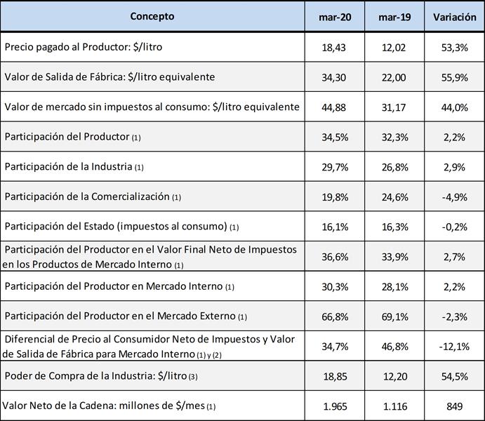 ene16/mar20 presenta una pérdida de $ 1,04/litro de leche equivalente o US$