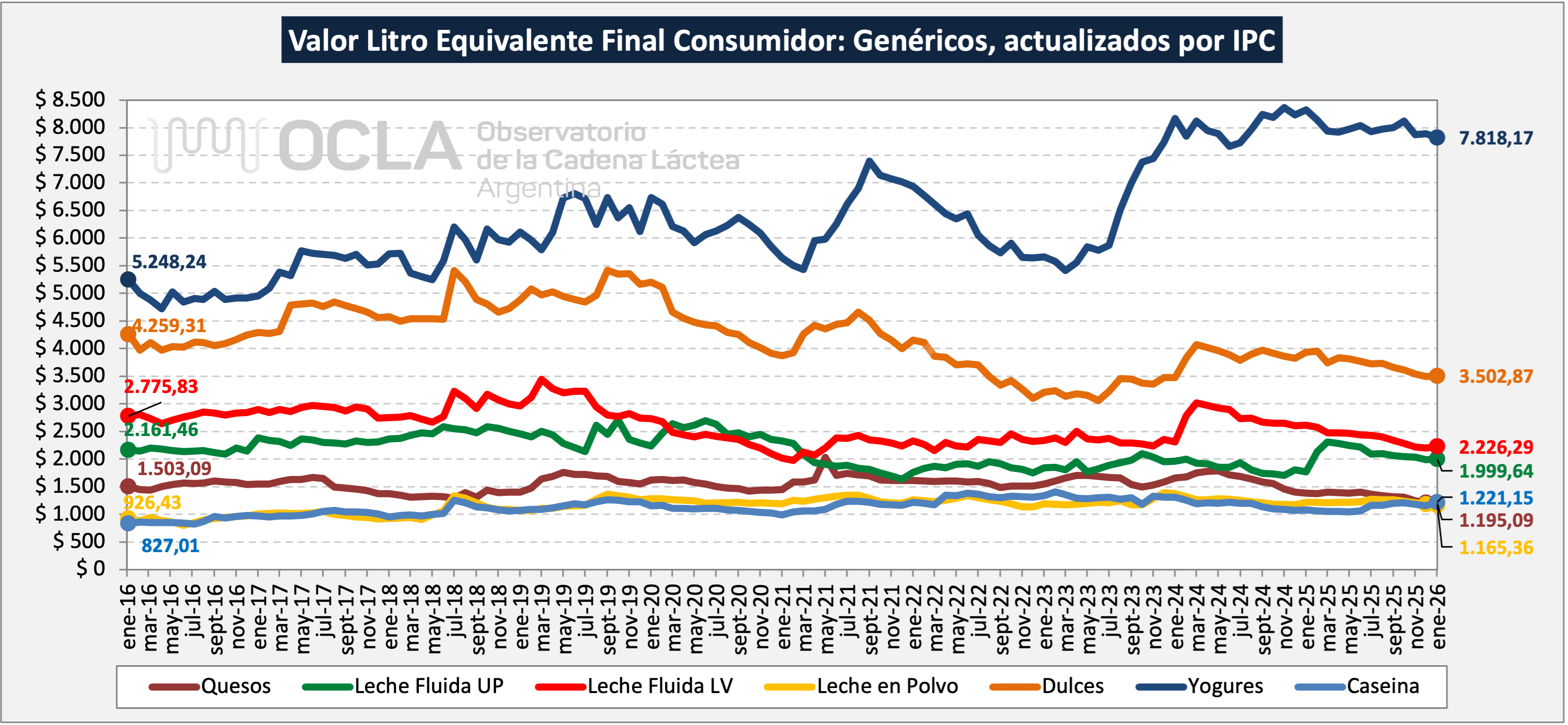 A partir de la idea de que el precio que paga un comprador expresa -de algún modo- el “valor” reconocido del bien que adquiere; el concepto de “valor por litro equivalente” (VLE) pretende exteriorizar el que le corresponde al “litro de leche cruda” en las diferentes etapas que lo convierten en un bien final de consumo. Las instancias en las que se practican las mediciones de precios son: Tranquera de productor, Planchada de industria, Consumidor final sin impuestos al consumo, Consumidor final (con impuestos al consumo). Dado que, excepto el que corresponde al de “tranquera productor”, los precios están referidos a unidades de productos diversos (quesos, leches fluidas, polvo, dulce, yogures, etc.) pero no en “litros de leche cruda”, el “VLE” traduce dichos precios en términos de los litros de leche empleados en su elaboración.