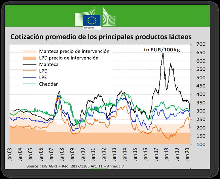 - El precio spot de la leche baja al 3 de mayo de 2020 a € 28,8 cent./kg. (US$ 0,32/litro).