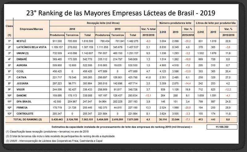 Leite Brasil lanzó esta semana el resultado del 23 ° Ranking de las compañías lácteas más grandes de Brasil en captación de leche en 2019. Las 13 compañías que figuran como las más grandes del sector tuvieron un crecimiento del 4,1%, totalizando 7.900 millones de litros (aproximadamente 21,6 millones de litros / día). Este aumento superó el crecimiento observado en el total de Brasil, publicado por la encuesta trimestral de IBGE, que fue del 2,3% en comparación con 2018.