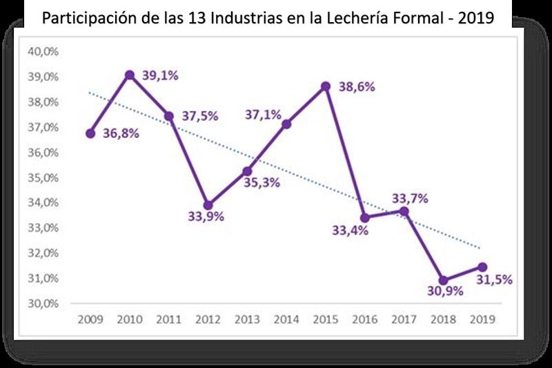 El volumen de las 13 empresas más grandes del sector representa el 31% del sector formal brasileño en 2019. Al analizar los últimos años de la encuesta, se observa una reducción en la participación de grandes productores de lácteos en el volumen formal total en el mercado brasileño. Cabe mencionar la ausencia de empresas relevantes para el ranking, como CCPR Itambé (con información no incluida desde el ranking 2018) y Lactalis (con información no incluida desde el ranking 2017).