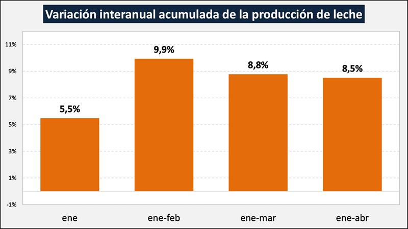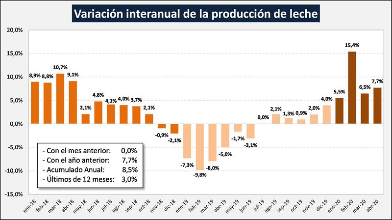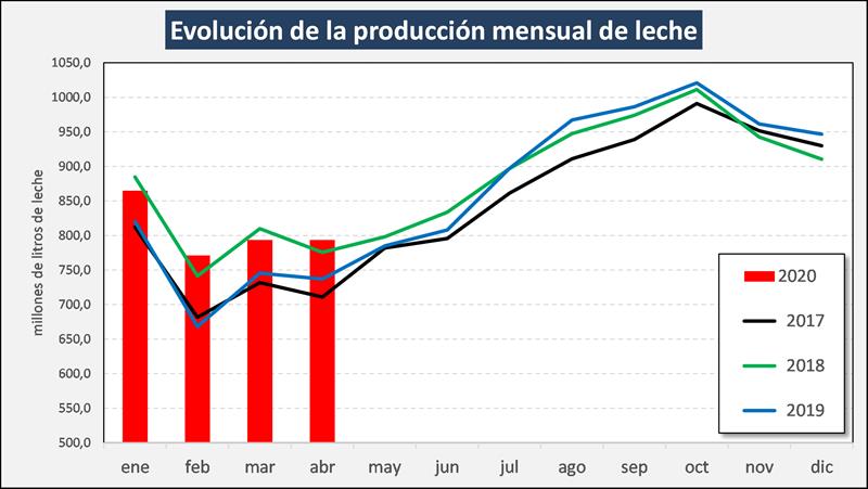 En el mes de abril de 2020 la producción fue de 793,6 millones de litros de leche, esto implica un valor prácticamente idéntico al mes anterior (+3,3% en el promedio diario) y un 7,7% más que igual mes del año anterior. El acumulado de los últimos 12 meses tiene un incremento del 3,0%, lo cual muestra la tendencia al crecimiento entre 2019 y la perspectiva 2020.