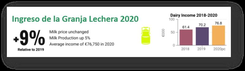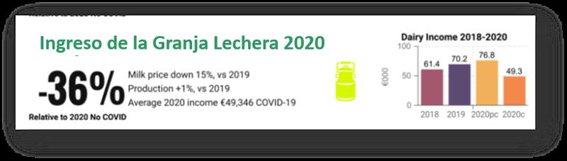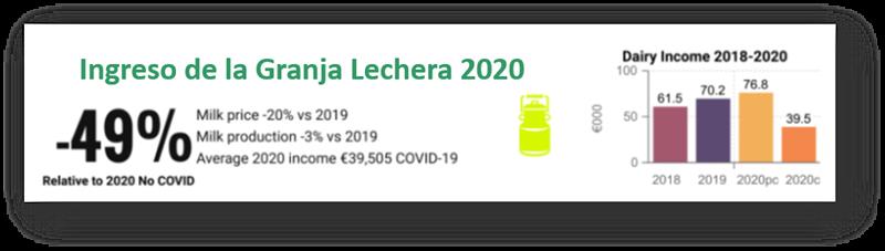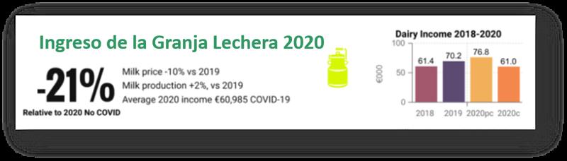 Los ingresos promedio de 'productos lácteos' se habían pronosticado (para 2020) en € 76.750 (antes de Covid-19). Según el Escenario 1, los ingresos lácteos promedio disminuirían en un 21%, a € 60.985. En el escenario 2, los ingresos promedio caerían un 36%, a € 49.346. En el tercer y peor de los casos, los ingresos lácteos promedio se reducirían esencialmente a la mitad, en un 49%, a € 39.505.