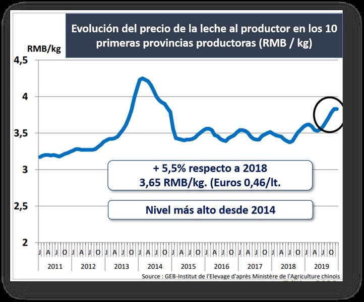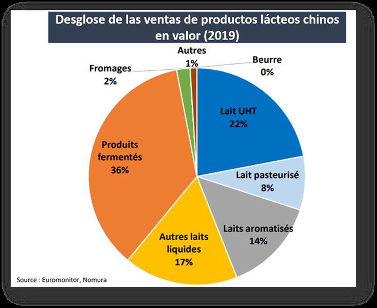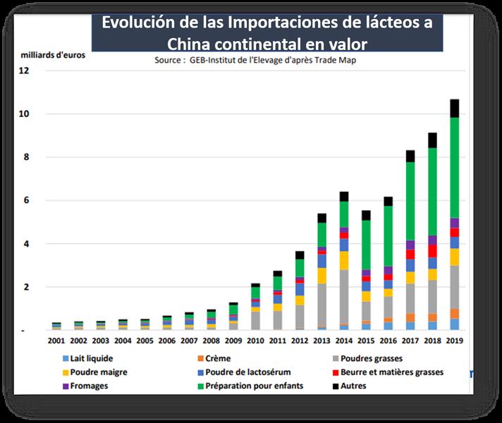 Las importaciones alcanzan los 10.700 millones de euros (+ 17%/2018) y representan el 4% de las importaciones agrícolas chinas, pero el 25% del consumo de leche en China. La leche en polvo para lactantes = 43% del valor total.