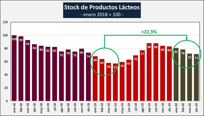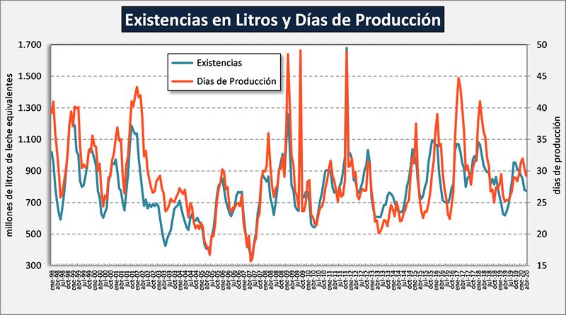 En lo que respecta al mes de abril en particular, las existencias son 32,2% en productos y 25,0% en litros de leche equivalentes, superiores que abril del año anterior, y representan 29 días de producción en abril actual, cuando el año anterior eran de 25 días.