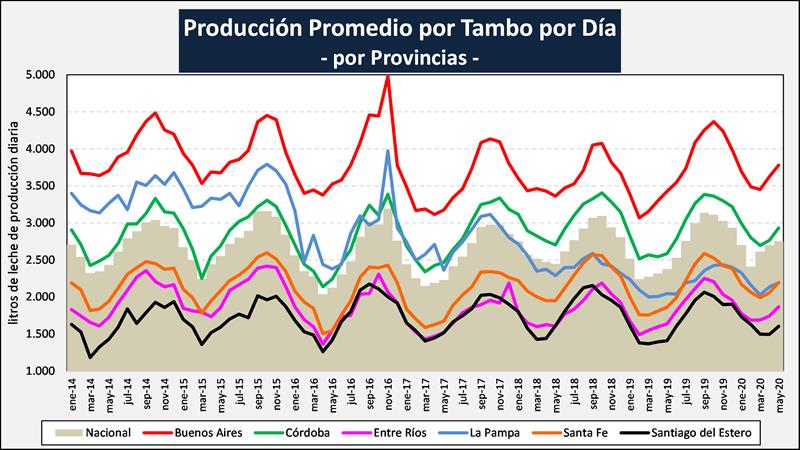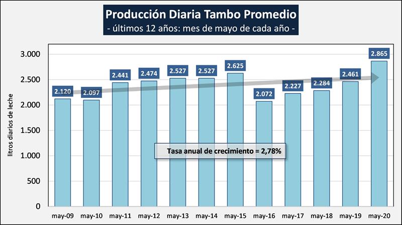 Sobre la base de la producción mensual y la cantidad anual de tambos (SENASA al 31/03/19), podemos inferir el tamaño del tambo promedio, unos 2.865 litros de leche diarios para mayo del 2020, un 16,4% más que el año anterior (cabe acotar que la producción en mayo 2020, fue 10,9% superior a mayo del 2019). Si evaluamos su comportamiento en el tiempo, a pesar de la disminución en el número de unidades productivas y en el número de vacas, el tambo promedio presenta en el período 2009-2020 una tasa de crecimiento acumulada anual del 2,78%, lo que permite, a pesar de la reducción en las unidades productivas y en el rodeo, el sostenimiento de los niveles productivos agregados a nivel país.