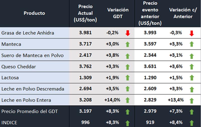 -GDT Price Index indica el promedio del cambio porcentual en los precios para cada especificación, ponderado por la cantidad de cada especificación vendida. GDT proporciona un cambio en el índice de precios de GDT del evento anterior para todos los productos, además de un equivalente para cada grupo de productos y cada combinación de grupo de productos/período de contrato. El índice de precios proporciona un reflejo más preciso de los movimientos de precios entre los eventos comerciales.