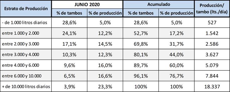 Otro dato relevante es que los tambos de más de 10.000 litros de leche diarios, representaban en junio del año pasado el 2,9% del total de tambos y el 19,4% de producción, con una producción promedio diaria de 16.996 litros de leche, lo que evidencia un incremento de este estrato en la participación general.