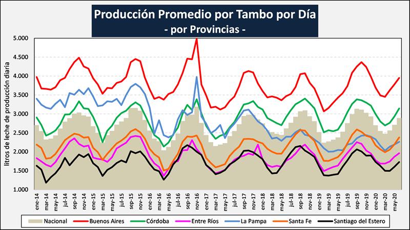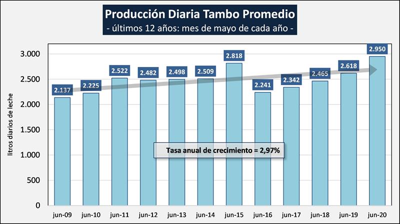 Sobre la base de la producción mensual y la cantidad anual de tambos (SENASA al 31/03/19), podemos inferir el tamaño del tambo promedio, unos 2.950 litros de leche diarios para junio del 2020, un 12,7% más que el año anterior (cabe acotar que la producción en junio 2020, fue 10,6% superior a junio del 2019). Si evaluamos su comportamiento en el tiempo, a pesar de la disminución en el número de unidades productivas y en el número de vacas, el tambo promedio presenta en el período 2009-2020 una tasa de crecimiento acumulada anual del 2,97%, lo que permite, a pesar de la reducción en las unidades productivas y en el rodeo, el sostenimiento de los niveles productivos agregados a nivel país.