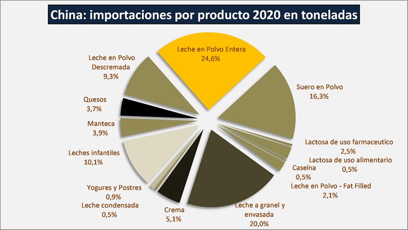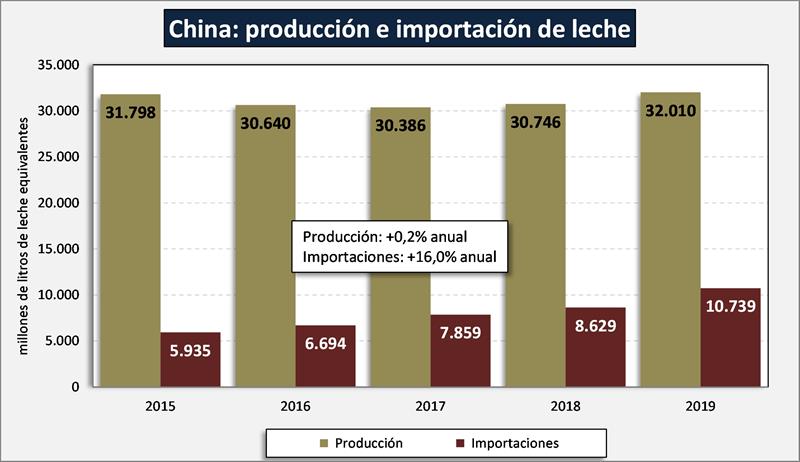China produce unos 32.000 millones de litros de leche, alrededor del 4,5% de la producción mundial de leche de vaca. Por su parte importa unos 11.000 millones de litros de leche equivalentes, es decir el 14% de lo que se comercializa en el mercado mundial (sin incluir las ventas intra Unión Europea).