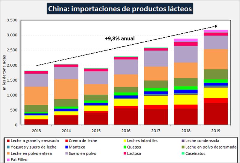 Las importaciones chinas de lácteos en el período 2013-2019 han crecido a una tasa anual del 9,8%, salvo en la crisis 2015 cuando sufrieron una leve baja.