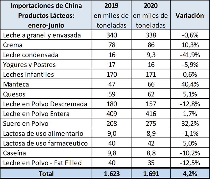 La demanda china de productos lácteos, después del crecimiento moderado de los últimos meses, registró un aumento significativo del 19,7% en volumen para el mes de junio de 2020.