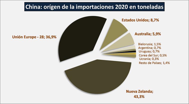 El principal volumen de importaciones proviene de Nueva Zelanda, luego le siguen de cerca los 28 países de la Unión Europea, y en menor medida Estados Unidos y el resto de los principales exportadores del ranking mundial.