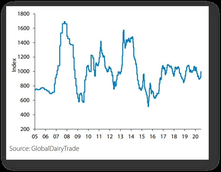 Los mercados mundiales de productos lácteos han superado las expectativas durante los últimos meses. Los precios alcanzados por los productos lácteos que hemos estado exportando en general tuvieron una tendencia a la baja durante el primer semestre de 2020. El primer evento GlobalDairyTrade (GDT) celebrado en julio resultó en un aumento del 8,3% en el índice de precios GDT, impulsado principalmente por los precios de la leche entera en polvo.