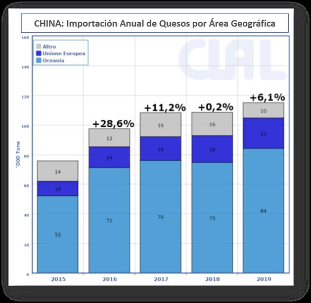 El consumo de queso en China siempre es limitado en comparación con el de la leche y el yogur, pero su potencial está en constante crecimiento: según un estudio del Intelligent Research Group, en 2025 el valor de sus ventas alcanzaría los 1.700 millones de dólares. El consumo hotelero representa el 50% de las ventas totales, pero durante el Covid-19 el consumo interno aumentó significativamente, estimado en un 32% en comparación con 2019, gracias sobre todo a la pizza.