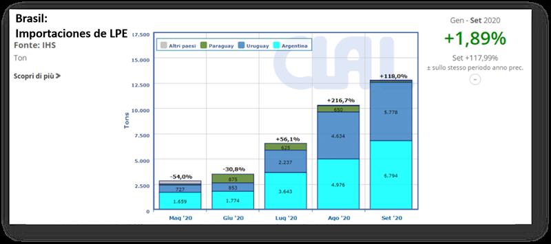 Argentina: en septiembre, aumentó significativamente sus exportaciones de LPE (+119,5%) y LPD (+162,0%) en comparación con septiembre de 2019. Los principales destinos fueron Brasil y Argelia.