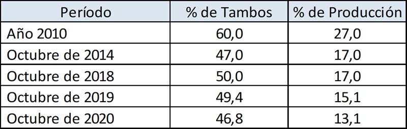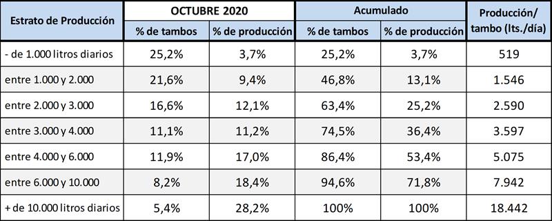 Puede observarse que los aproximadamente 530 tambos del estrato de + de 10.000 litros de producción diaria, que produjeron durante el mes de octubre un promedio de 18.442 litros diarios, representan el 5,4% del total de tambos y aportan el 28,2% de la producción total. Esto es más del doble de leche qué la que aportan los casi 4.600 tambos de menos de 2.000 litros diarios y que son el 46,8% de los tambos totales, pero sólo tienen el 13,1% de la producción nacional.