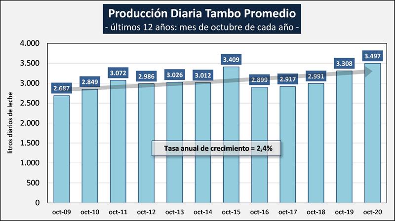 Sobre la base de la producción mensual y la cantidad anual de tambos (SENASA al 31/03/20), podemos inferir el tamaño del tambo promedio, unos 3.497 litros de leche diarios para octubre del 2020, un 5,7% más que el año anterior. Si evaluamos su comportamiento en el tiempo, a pesar de la disminución en el número de unidades productivas y en el número de vacas, el tambo promedio presenta en el período 2009-2020 una tasa de crecimiento acumulada anual del 2,4%, lo que permite, a pesar de la reducción en las unidades productivas y en el rodeo, el sostenimiento de los niveles productivos agregados a nivel país.