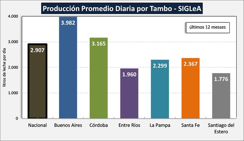 La producción promedio diaria por tambo y por provincia que graficamos aquí es la que arrojan los datos de SIGLeA – LUME sobre unas 8.200 liquidaciones de leche mensuales.