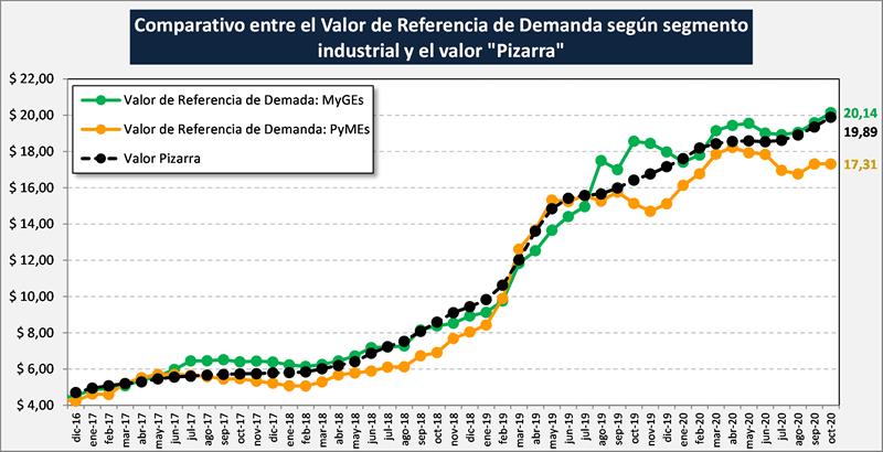 Se observa en el gráfico una mayor capacidad de pago en el mes de octubre/20 del segmento de MyGEs de $ 20,14/litro ($ 0,25 por encima del precio pagado) y un valor para el segmento PyMEs de $ 17,31 ($ 2,58 por debajo del precio pagado), que está por décimo séptimo mes consecutivo por debajo del precio pizarra.
